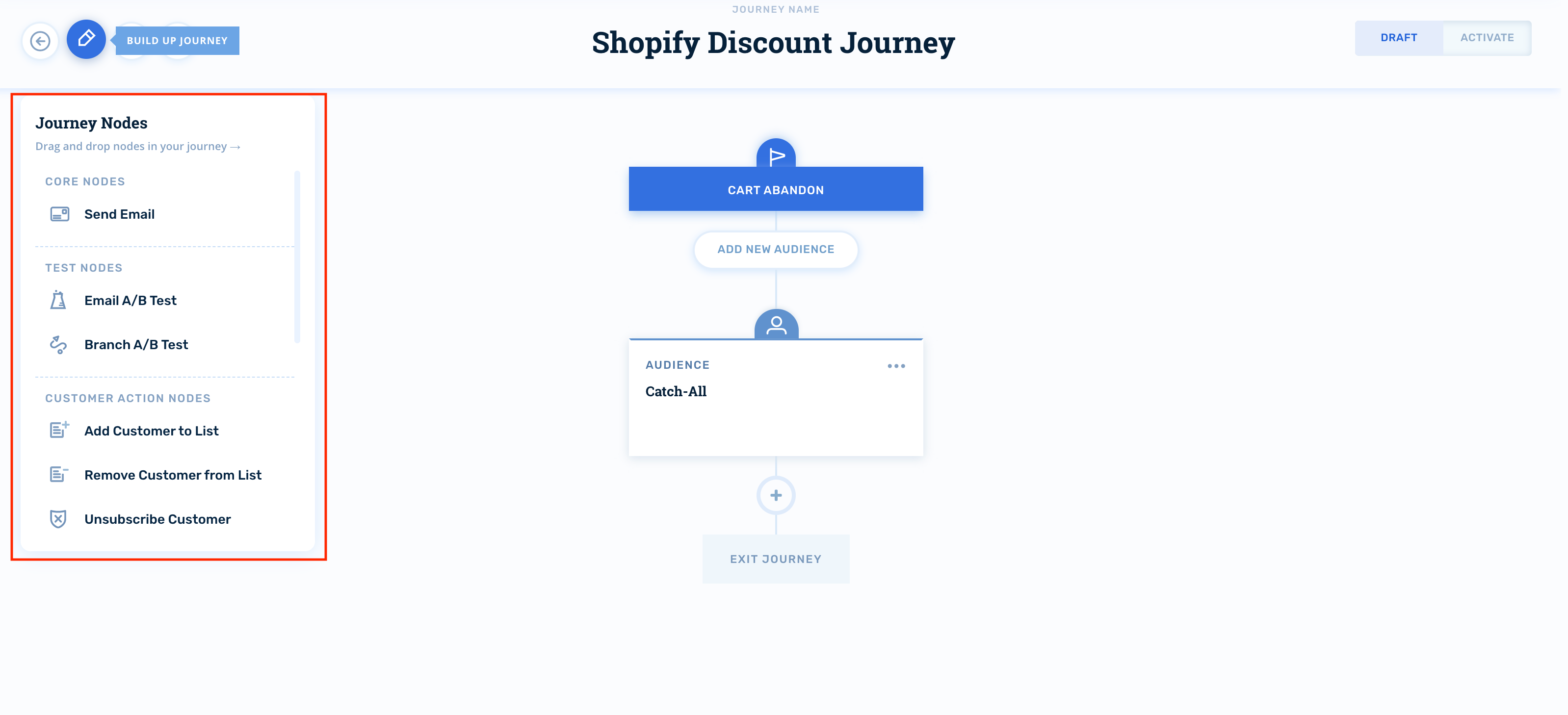 Once you are editing the Journey you want to use the discount codes, you can open the list of available Journey nodes.